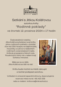 Ve čtvrtek 12. prosince pořádáme od 17.00 hodin ve studovně setkání s českoskalickou rodačkou Mgr. Jitkou Kolářovou. Představí nám knihu plnou rodinných pokladů, v podobě více než 250 inspirativních receptů ...