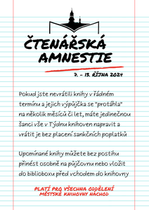 V rámci celostátní akce Týden knihoven, probíhající ve dnech 7. - 13. října, vyhlašuje naše knihovna čtenářskou amnestii. Pokud jste nevrátili knihy v řádném termínu a jejich výpůjčka se "protáhla" na ...