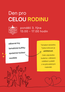 V pondělí 3. října zahájíme Týden knihoven programem pro celou rodinu. V dětském oddělení můžete těšit na zábavné hry, soutěže a společné tvoření z recyklovatelných materiálů.