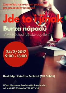 Zveme Vás na Burzu nápadů, která se uskuteční v pátek 24. 2. 2017 v dětském oddělení Městské knihovny v Náchodě. Cílem této akce je získat od ostatních knihovníků a samozřejmě jim také nabídnout ...