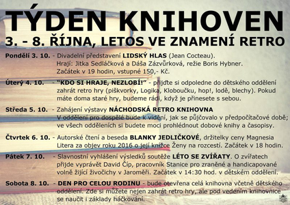 První týden v říjnu patří tradičně knihovnám. Je totiž Týden knihoven, letos už po dvacáté, a to pro nás, knihovnice a knihovníky, znamená jediné – chceme oslovit ještě více čtenářů a ...