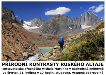 Ve čtvrtek 21. května vás zveme na promítání s cestovatelskou přednáškou Michala Martinka Přírodní kontrasty ruského Altaje. Pestrá a nedotčená krajina, krásné hory s ledovci, jiná kultura, volnost pohybu a hlavně místo, o ...