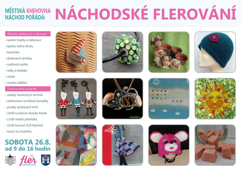 Na sobotu 26. srpna připravujeme v naší knihovně již 5. Náchodské flerování. Po celý den, od 9 do 16 hodin, si můžete v hale a na dvorku knihovny prohlédnout a nakoupit různé výrobky od prodejců z Fleru - textilní hračky a dekorace, šperky všeho druhu, keramiku, drátované výrobky, tašky, kabelky, módu a mnoho dalšího. Ani letos nebude chybět divadelní představení pro děti (v 10 hodin), módní přehlídka (ve 13 hodin) nebo koncert ZUŠ Náchod (v 15 hodin). O občerstvení se postará Mlsná farmářka. Budete-li mít chuť a čas, určitě přijďte!