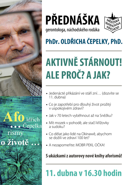 Ve čtvrtek 11. dubna zveme od 16.30 hodin všechny – a hlavně ty ve věku 55 až 105 let – do studovny na přednášku gerontologa, náchodského rodáka, PhDr. Oldřicha Čepelky, PhD. Dozvíme se, co je zapotřebí pro dlouhý život prožitý v uspokojivém zdraví, jak v 70 letech vyběhnout až na Sněžku nebo co dělat jako lidé na Okinawě, abychom se dožili ve zdraví 100 let. S ukázkami z autorovy nové knížky aforismů! Vstup volný.