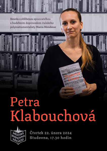 Ve čtvrtek 22. února vás od 17.30 hodin zveme do studovny na literárně-hudební besedu. Novinářka a spisovatelka Petra Klabouchová pochází z Prachatic, ale žije střídavě v Itálii, USA a České republice, kde se věnuje managementu rockových kapel. Především je ale autorkou knih Upíří storky, Poslední kubánské pomeranče, Podvod zlatého faraona, thrilleru Anglická zahrada, nebo detektivního příběhu Prameny Vltavy, za nějž získala Cenu Johanna Steinbrenera. Vloni jí vyšel román U severní zdi, inspirovaný osudy dětských obětí komunismu, a humorné příběhy z rockového podsvětí Na plný koule. Besedu nejen o těchto knihách doprovodí hrou na akustickou kytaru italský rockový polyinstrumentalista Marco Mendess.