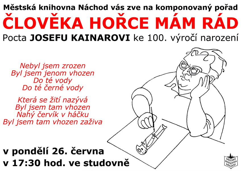 V pondělí 26. června vás zveme na komponovaný pořad k 100. výročí narození básníka a všestranného umělce Josefa Kainara Člověka hořce mám rád. Začátek je v 17:30 hod. ve studovně.