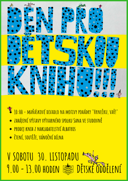 V sobotu 30. listopadu se od 9.00 do 13.00 hodin opět zapojíme do celostátní akce Den pro dětskou knihu. Děti se mohou těšit na bohatý program plný čtení, her a vyrábění. Mimo jiné připravujeme i maňáskové divadlo v podání Jaroslavy Holasové na motivy pohádky „Hrnečku, vař!“ Po celý den budeme také prodávat dětské knihy z nakladatelství Albatros za zvýhodněnou cenu.