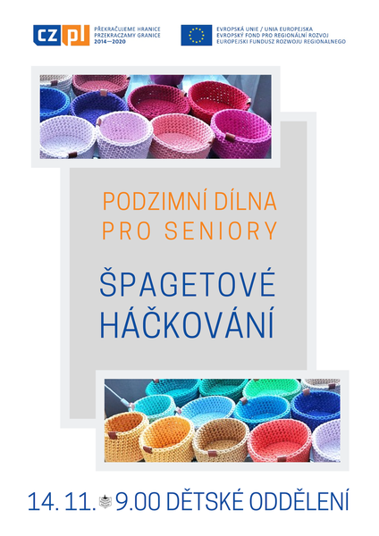 Ve středu 14. listopadu po delší odmlce pokračujeme v cyklu dílen pro seniory, který je podpořen z projektu Evropské unie Aktivní senior polsko-českého příhraničí. Tentokrát budeme háčkovat košíky z tzv. špagetové příze. Přihlášky přijímáme ve studovně, vyrábět budeme tradičně v dílně dětského oddělení od 9.00 hodin.