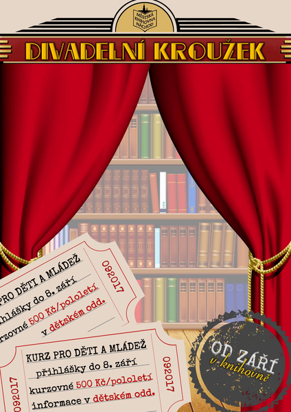 Od září 2017 připravujeme pro děti novinku. Svoji činnost zahájí divadelní kroužek pro děti a mládež pod vedením Moniky Jelínkové. Přihlášky přijímáme v oddělení pro děti do 8. září. Počet členů souboru je omezen, tak neváhejte. Kurzovné za pololetí je 500,- Kč. Těšíme se na vás. Zájemci o divadelní kroužek se sejdou na informační schůzce ve středu 13. září v 15:30 hod. v dětském oddělení.