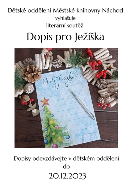 Před Vánoci se mohou kreativní děti zapojit do literární soutěže Dopis pro Ježíška. Rozsah i provedení necháme zcela na vás - těšíme se na všechny nápady a tajná přání. Práce odevzdávejte v dětském oddělení nejpozději do20. prosince.