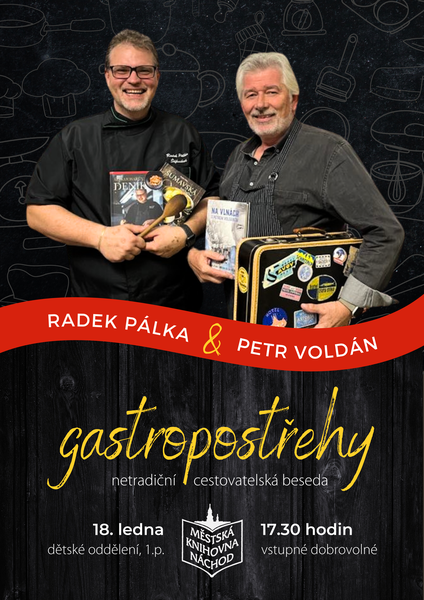 Vaření a cestování po světě si můžete užít ve čtvrtek 18. ledna od 17.30 hodin na netradiční besedě se dvěma rodáky z východních Čech – novinářem Petrem Voldánem a kuchařem Radkem Pálkou. Dozvíte se, jak se bezpečně a rychle dostat do národního symbolu Ázerbájdžánu – granátového jablka, čím se dají ošálit zahraniční myslivci, jak se jí kovovými hůlkami nebo jaké to je být v kuchyni se Slovákem, Bangladéšanem a Pákistáncem. Vypravíme se s mikrofonem a kamerou do kuchyní v Gruzii, Anglii nebo Číně a s vařečkou do Itálie, na Zanzibar či do Ameriky. Petr Voldán i Radek Pálka mají zkušenosti rozhlasové i televizní, což zaručí, že se při besedě rozhodně nebudete nudit a možná i něco zvláštního ochutnáte. Vstupné dobrovolné.