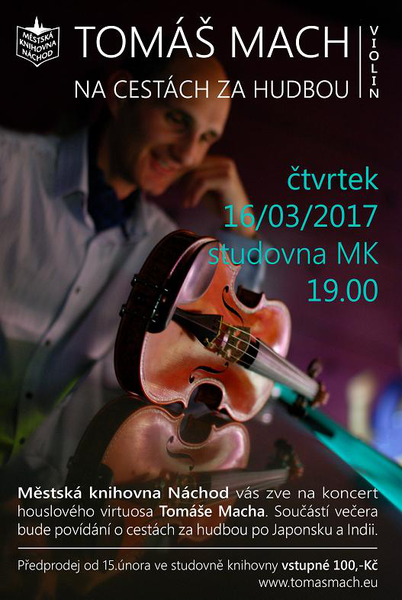 Ve čtvrtek 16. března vás zveme na koncert houslového virtuosa Tomáše Macha. Součástí večera bude povídání o cestách za hudbou po Japonsku a Indii. Koncert začíná v 19 hodin ve studovně. Vstupné: 100,- Kč.