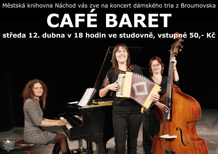 Zveme vás na koncert dámského tria z oblasti Broumovska CAFÉ BARET. Kapela hraje v obsazení harmonika, piano a kontrabas. Její repertoár tvoří zejména francouzské písně kdysi zpívané po přístavních zákoutích, putykách, kavárnách a vinárnách. Zpěvačka a harmonikářka Jessica pochází z kanadského Québecu, můžete se tedy mimo jiné těšit na zajímavou podobu francouzštiny "zpoza oceánu".