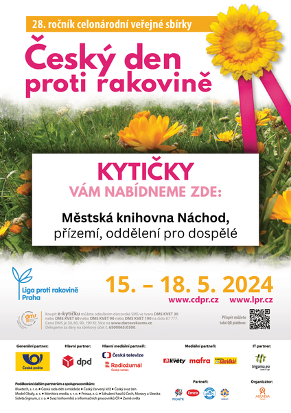 Od středy 15. do soboty 18. května se opět připojíme k Českému dni proti rakovině prodejem symbolických kytiček. Jejich koupí v půjčovně pro dospělé podpoříte sbírku, kterou již po 28. pořádá Liga proti rakovině, tentokrát s tématem "Prevence rakoviny prsu a screeningové programy." Přispěním libovolné částky umožníte Lize plnit své poslání, kterým je mimo jiné zlepšení kvality života onkologických pacientů, podpora onkologické výuky, výzkumu a vybavení onkologických center.