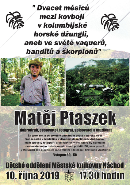 Ve čtvrtek 10. října vás od 17.30 zveme do dětského oddělení na cestopisnou besedu s Matějem Ptaszkem, který je prvním Evropanem, jenž strávil více než dvacet měsíců v divokém kolumbijském departmentu Antioquia. Jaké je to ocitnout se uprostřed nefalšované divočiny? Jaké to je být akceptován drsnými horskými kovboji, kteří mezi sebe jen tak někoho nepřijmou? Jaké pocity vás svírají, když se nacházíte na území neblaze proslulé povstalecké skupiny FARC, mimo kontrolu vlády? Co se vám honí hlavou, když v horách narazíte na opravdového zlatokopa, který rýžuje drahý kov v řece jako z románu Jacka Londona? Na to vše se můžete zeptat Matěje Ptaszka osobně. Vstupné 50,- Kč.