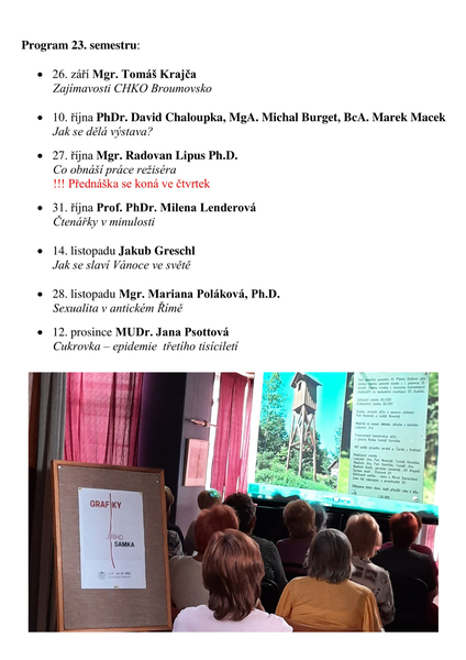V pondělí 26. září proběhne od 15.00 hodin ve studovně knihovny první beseda Náchodské univerzity volného času. Pokud bude účastníků tolik, jako v minulém semestru, budou i následující přednášky probíhat v jednom termínu, a to od 15.00 hodin. Bude-li zájemců více, můžeme opět skupiny rozdělit.