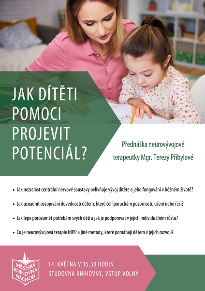V úterý 14. května zveme od 15.30 hodin do studovny všechny rodiče, kteří chtějí aktivně podpořit své děti na jejich cestě k úspěchu, na přednášku neurovývojové terapeutky Mgr. Terezy Přibylové. Dozvíme se, jak může nezralost centrální nervové soustavy ovlivnit vývoj dítěte a jeho fungování v běžném životě. Společně se podíváme i na to, jak usnadnit osvojování dovedností dětem, které čelí poruchám pozornosti, učení a řeči. Dále budou představeny principy neurovývojové terapie INPP a další metody, které pomáhají dětem v jejich rozvoji. Přednáška poskytne rodičům užitečné informace, tipy a nástroje, jak lépe porozumět potřebám svých dětí a jak je podporovat v jejich individuálním růstu. Vstup volný.