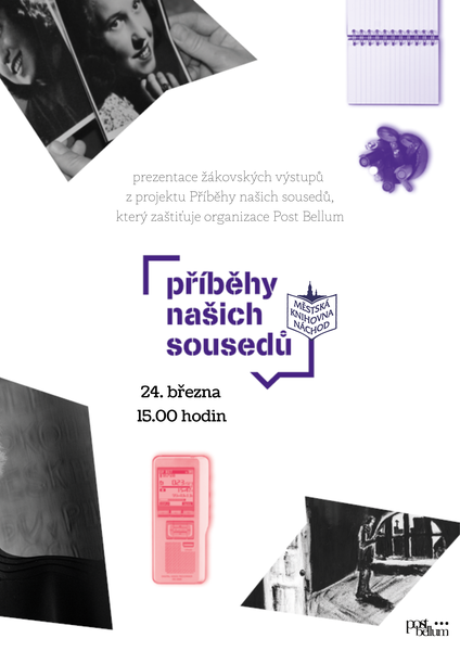 V pátek 24. března v 15.00 hodin se bude v prostorách dětského oddělení konat prezentace žákovských výstupů z projektu Příběhy našich sousedů, který zaštiťuje organizace Post Bellum. V rámci tohoto projektu se žáci z 8. a 9. tříd vypravili za pamětníky, se kterými natáčeli rozhovory o jejich životě, názorech, příhodách a životních zkušenostech. Jejich příběhy následně zpracovali v nejrůznějších podobách od audioreportáže po animaci.