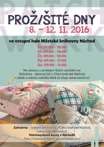 Od 26. do 30. dubna vás zveme na výstavu prací účastnic z náchodských kurzů patchworku, pořádaných od roku 2013 v domě Církve bratrské s lektorkami JUDr. M. Máchovou a Mgr. E. Malinovou. Během výstavy si můžete koupit šité maličkosti, v pátek a v sobotu bude možné si zakoupit i galanterní zboží, látky a doplňky.