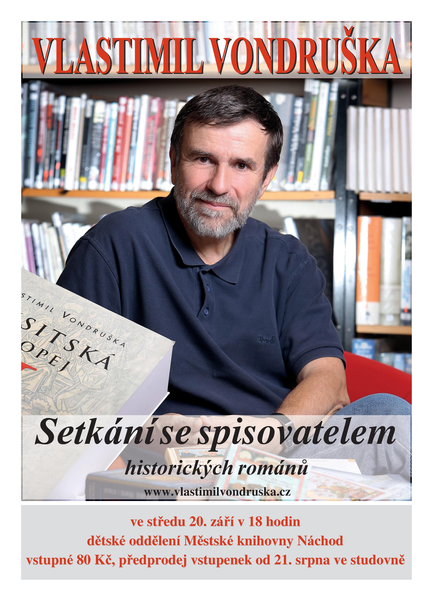 Ve středu 20. září vás zveme na setkání se spisovatelem a historikem Vlastimilem Vondruškou. Nepůjde o klasickou besedu, ani o přednášku, ale jak sám říká, jde o ona-man-show, v němž se pokouší zábavně vyprávět o životě, své literární tvorbě a také o životě našich předků. Není to ovšem pohled obrácený jen do minulosti, protože dějiny se neustále opakují, někdy až s děsivou pravidelností. I tom bude řeč.