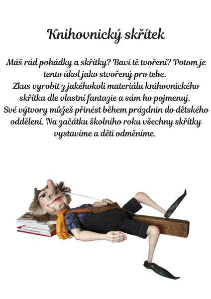 Máš rád pohádky a skřítky? Baví tě tvoření? Potom je tento úkol jako dělaný pro tebe. Zkus vyrobit z jakéhokoli materiálu knihovnického skřítka dle vlastní fantazie, pojmenuj ho a přines během prázdnin do dětského oddělení. Na začátku školního roku všechny skřítky vystavíme a jejich autory odměníme.