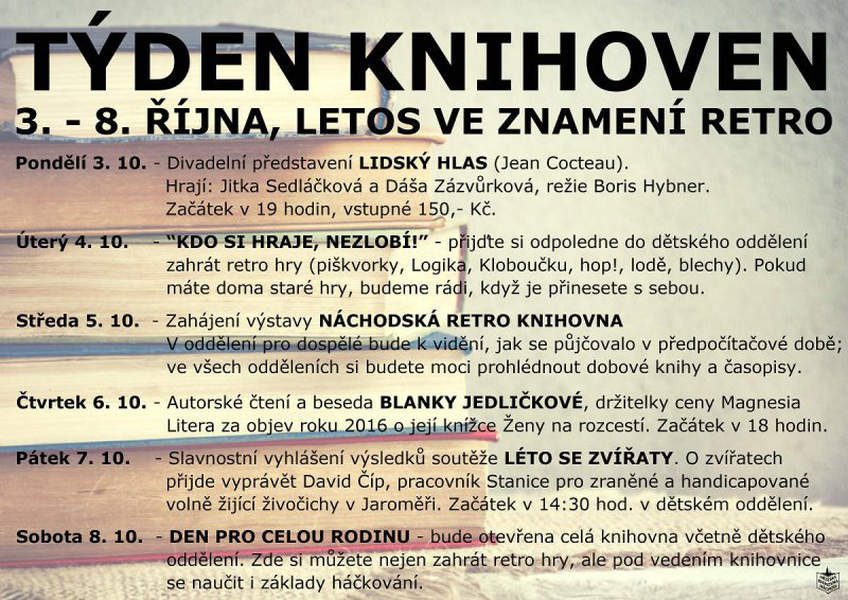 Středa 5. 10. – Zahájení výstavy Náchodská retro knihovna. V oddělení pro dospělé bude k vidění, jak se půjčovalo v předpočítačové době; ve všech odděleních si budete moci prohlédnout dobové knihy a časopisy.