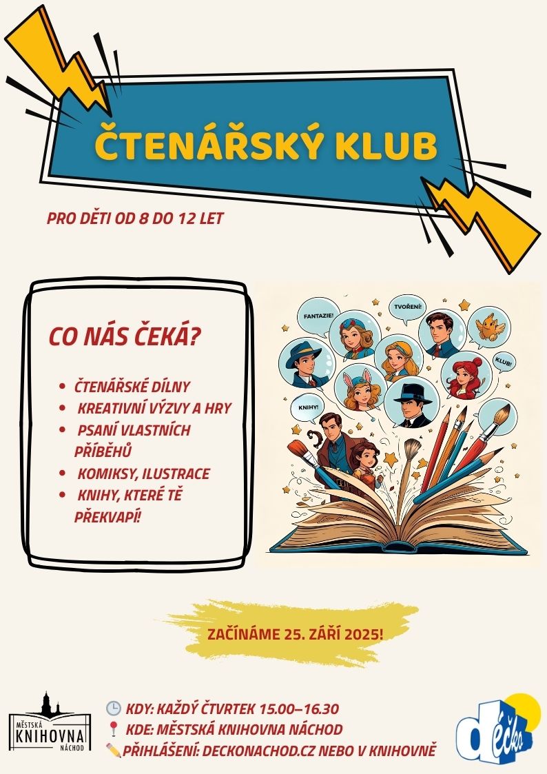 Pro knihomoly od 8 do 12 let. Společně prozkoumáme svět knih! Čekají nás čtenářské dílny, všelijaké kreativní výzvy, tvoření, psaní a hlavně spousta skvělých knih. Každý čtvrtek 15.00–16.30 v dětském oddělení. Vede Veronika Nováková.