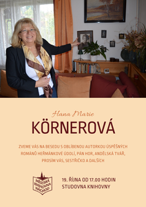V úterý 19. října vás od 17.00 hodin zveme na setkání s Hanou Marií Körnerovou (vlastním jménem Hanou Martinkovou). Oblíbená spisovatelka je autorkou především dobrodružných historických románů. Mezi nejznámější patří romantická ...