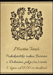 Ve středu 3. října proběhne od 18.00 hodin ve studovně přednáška Martina Tesaře na téma Podnikatelská rodina Bartoňů z Dobenína, jak ji (ne)znáte.