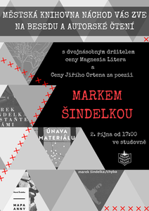 V pondělí 2. října v 17 hodin vás zveme na besedu a autorské čtení se spisovatelem Markem Šindelkou, držitelem Ceny Jiřího Ortena za poezii (2006) a dvou Magnesií Liter za prózu ...