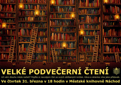 Na čtvrtek 31. března od 18 hodin v oddělení pro dospělé pro vás chystáme Velké podvečerní čtení. Už vám dlouho nikdo nečetl? Pojďte si navzájem číst ze svých oblíbených knížek. Káva, ...