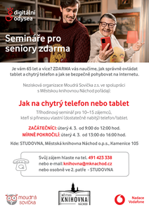 Ve spolupráci s neziskovou organizací Moudrá Sovička nabízíme zdarma seminář pro seniory ve věkové kategorii 65+, kteří se chtějí naučit, jak správně ovládat tablet nebo chytrý telefon a jak ...