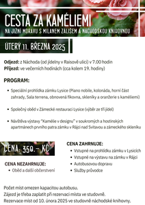 V úterý 11. března pořádáme v rámci NUVČ jednodenní výlet na jižní Moravu s Milanem Zálišem. Čeká nás speciální prohlídka zámku Lysice, společný oběd a návštěva výstavy Kamélie v designu v ...