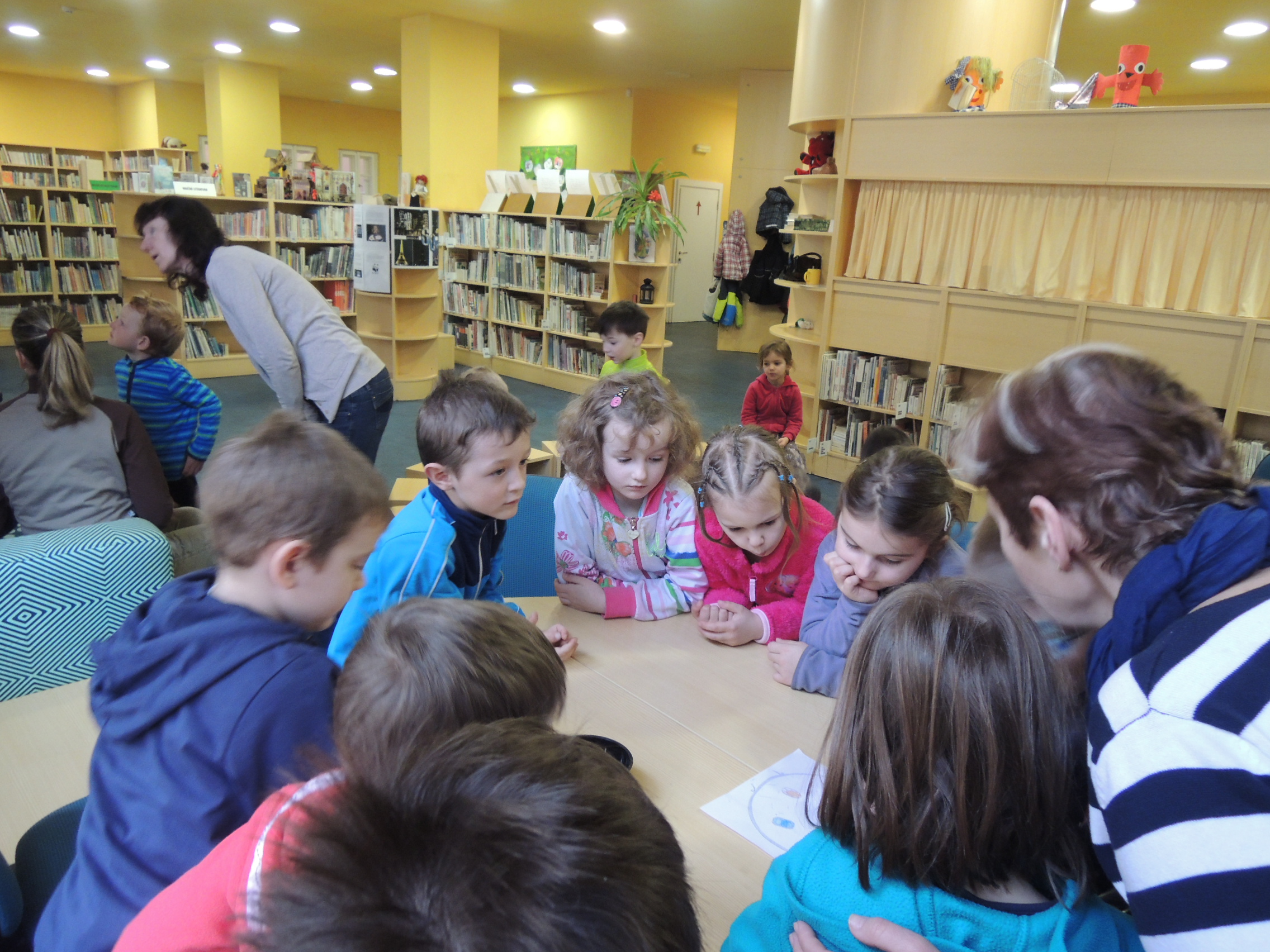 Seznámení s knihovnou. Jak funguje knihovna a čím se liší od knihkupectví? Jak se chováme ke knížkám? Čtení z knížek, hádanky, drobné úkoly a otázky. Krátká dramatizace úryvků z knížek.